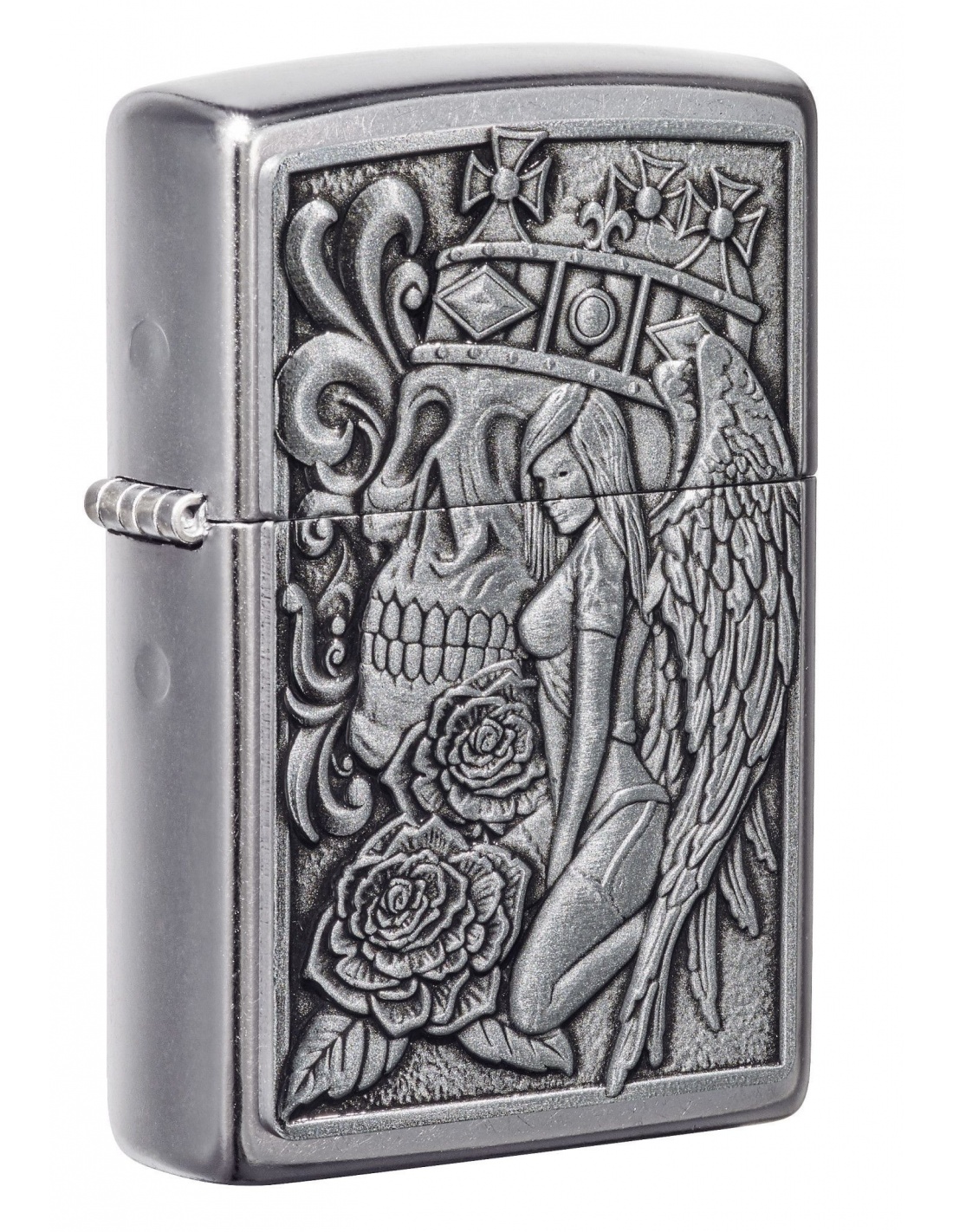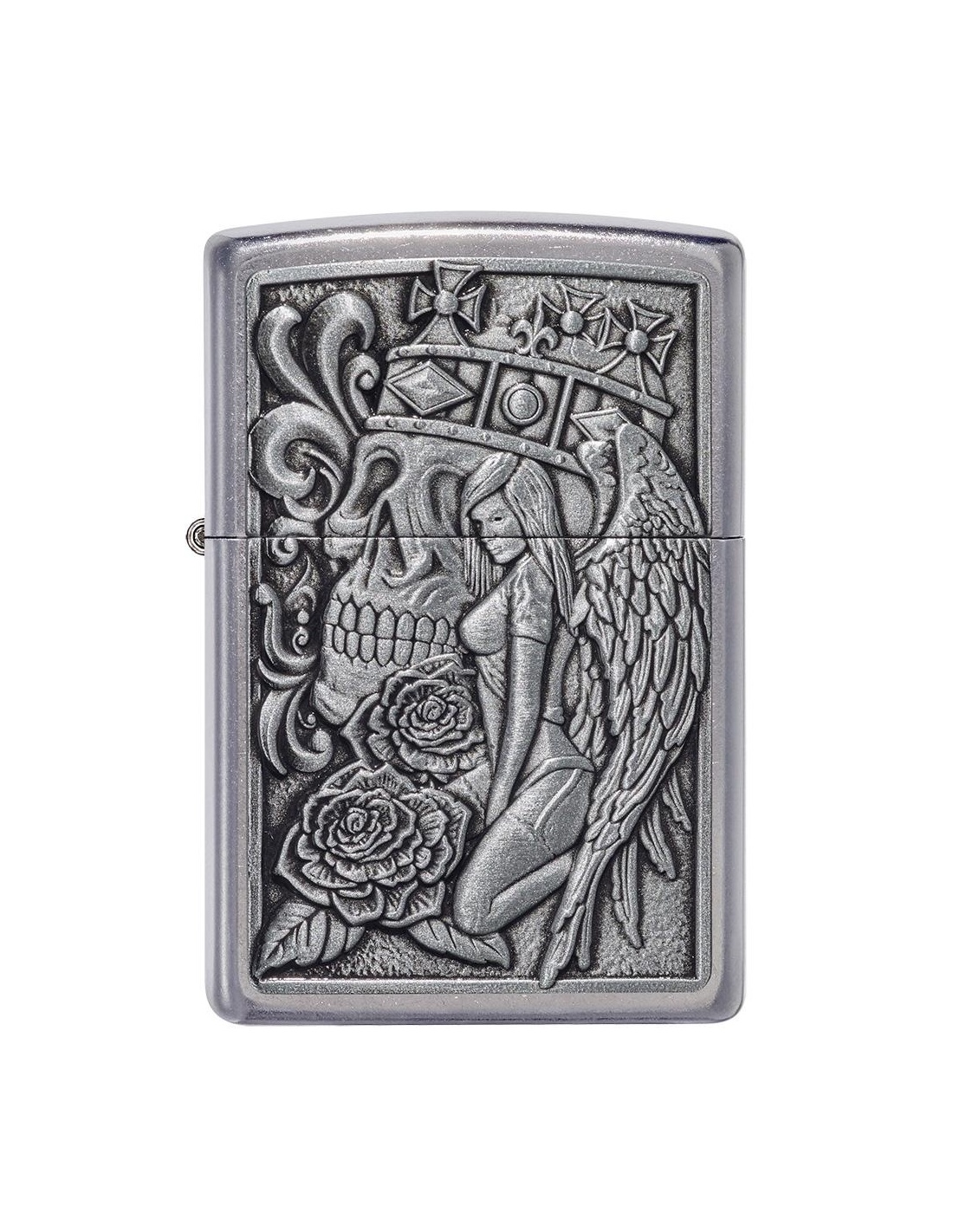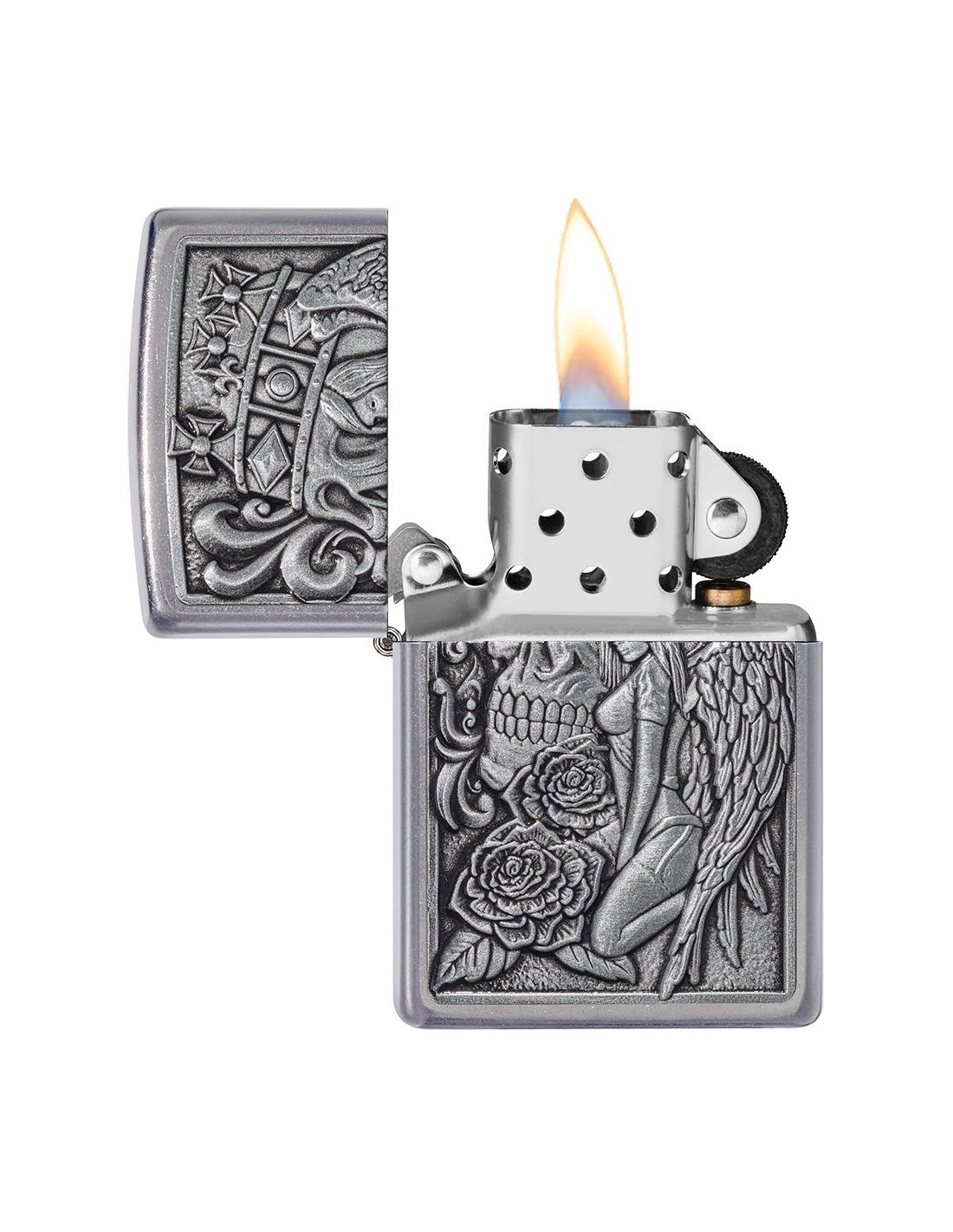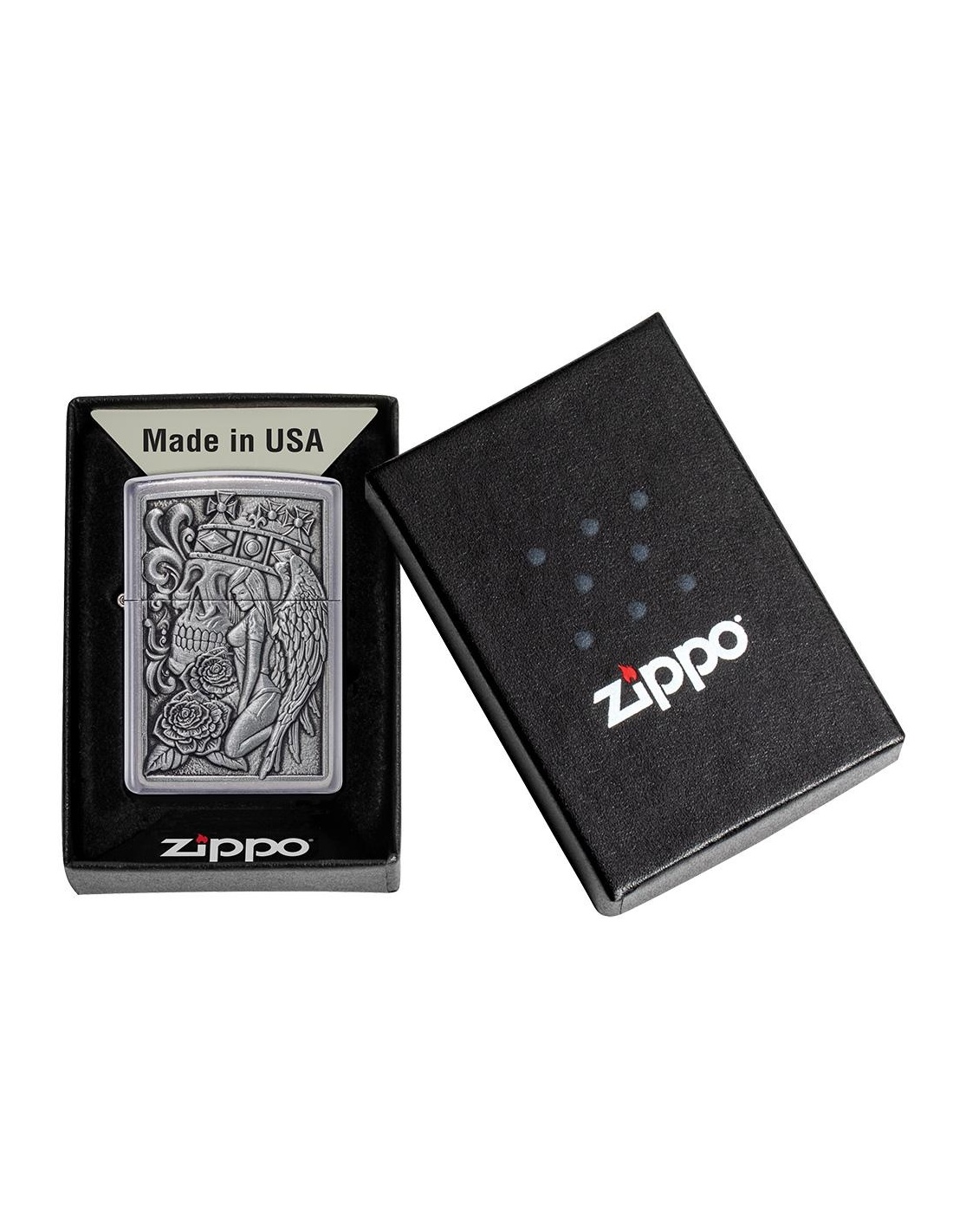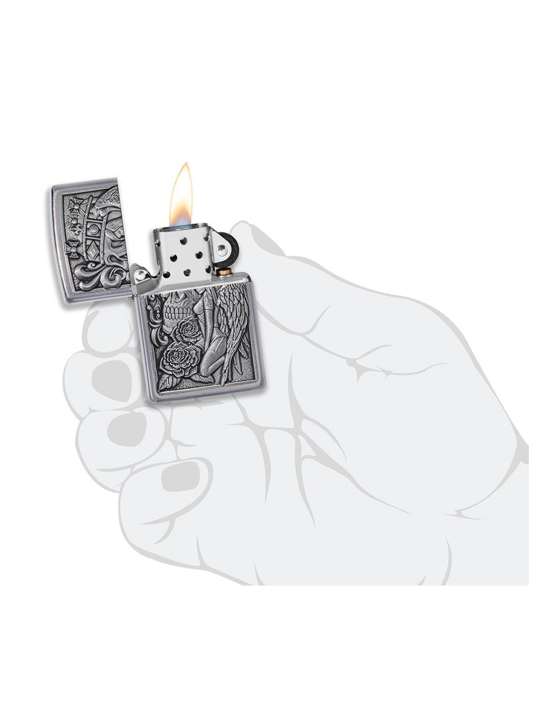 A Zippo 49442 Skull and Angel Emblem öngyújtó az Egyesült Államokban gyártott termék, a Pennsylvania-ban levő híres badfordi Zippo Manufacturing Company cég által. A Zippo öngyújtók kiváltképpen a Második Világháború idején váltak népszerűvé, amikor kizárólag az amerikai hadsereg részére gyártották őket és jelen pillanatban a Zippo öngyújtó, egy amerikai katona alapfelszereltségének tartozéka. A 60-as években a koncertek kedvelői Zippo gyújtókat gyújtottak meg és emeltek a magasba, a színpadon levő művészek üdvözlése végett, ezt a gesztust ”Zippo Moment”-ként emlegették. A Zippo öngyújtók újratölthetőek, időállóak és kedvezőtlen szeles feltételek mellett is meggyújthatóak. Ma már a Zippo öngyújtókat több mint 100 országban forgalmazzák és számos lelkes gyűjtő részére gyűjteménydarabbá vált.
